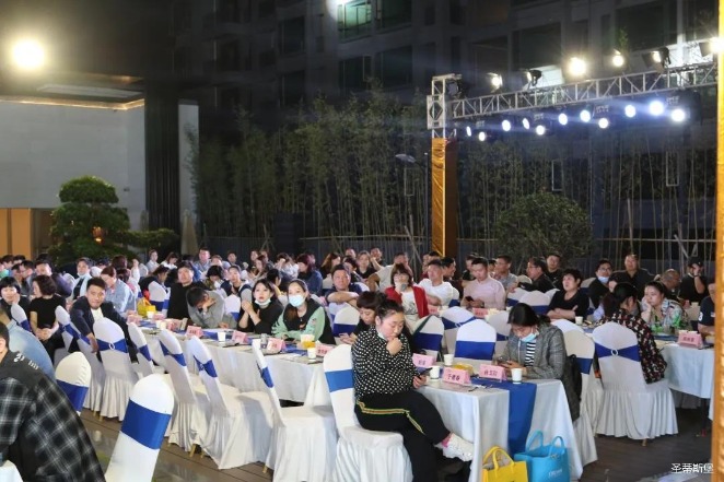经销商晚宴当日晚6时许,以【乘“圣”跨越】为主题的,多宝电竞集团第45届国际家具展接待晚宴暨2020年度优秀经销商颁奖盛典,在营销中心四楼景观花园隆重举行,来自全国各地的经销商朋友欢聚一堂,共同分享一场精彩纷呈的晚宴。