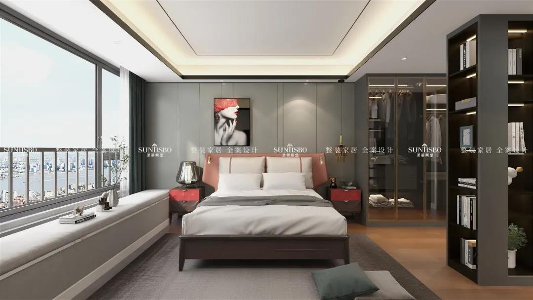 主卧的床是意式轻奢时尚与东方雅韵极致融合,没有半点突兀和乖张。,意大利最出名的便是它的工艺与设计,时尚的莫兰迪色系、轻奢金属的运用,体现娴熟的意式家具设计底蕴,两者之间融合的相得益彰。