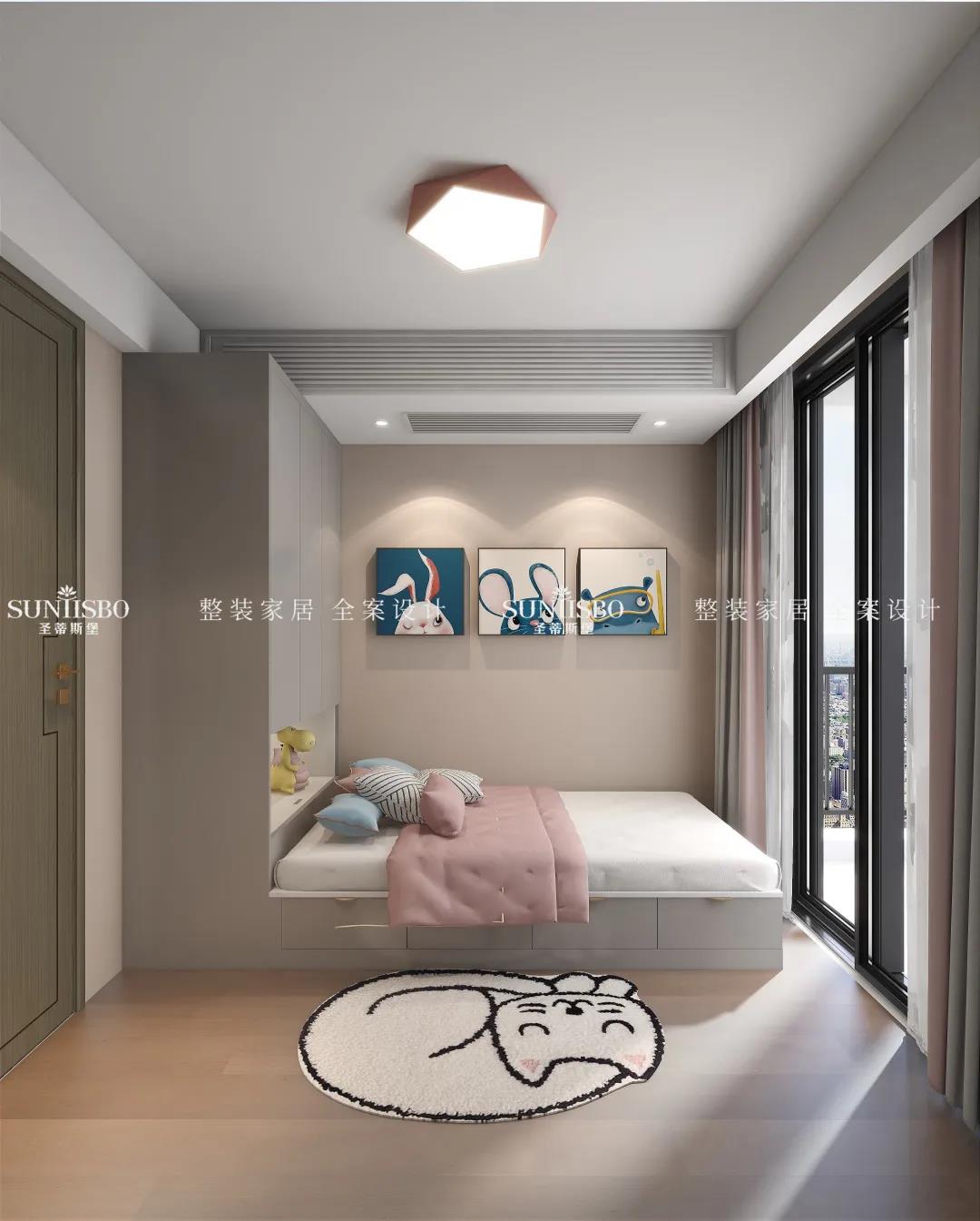 在设计之前,业主就预留了宝宝房,宝宝房实用又温馨,榻榻米床可以做收纳柜使用,收纳宝宝的换季衣服、玩具等。在色彩上搭配也是采用的莫兰迪色系。这样的儿童房谁能不爱呢?