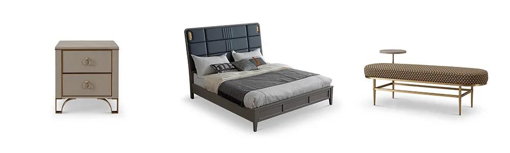 床屏时尚的雾霾蓝色,与素雅的床品营造出一种低调的简奢氛围。金属点缀着柜体拉手,床尾凳、床头柜等微小细节,让生活充满着内在涵养与力量。