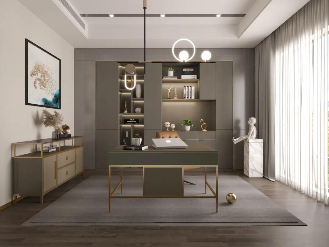 书房用现代手法定制了一个审美与意境并存的阅读空间,极具生活仪式感。整体嵌入式书柜,用浅灰打底,深灰为框架,让身心阅读片刻沉浸。
